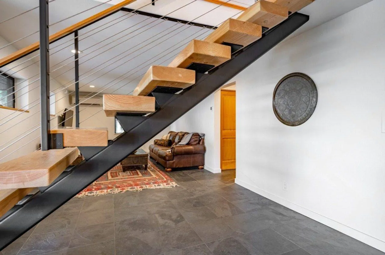 Идея для вашей лестницы: Для создания еще более выразительного контраста рассмотрите сочетание черного металлического каркаса со ступенями из выбеленного дуба. Это придаст интерьеру нотки скандинавского стиля и сделает пространство визуально светлее.